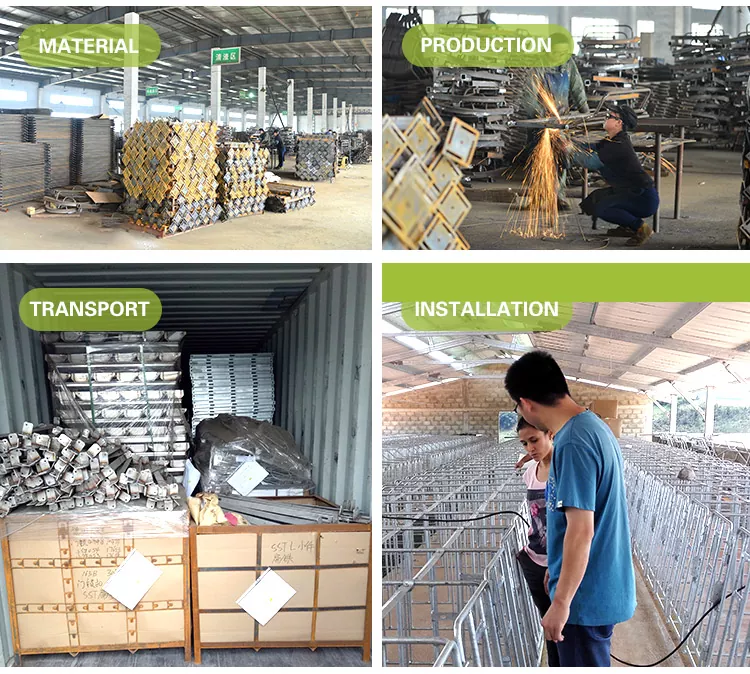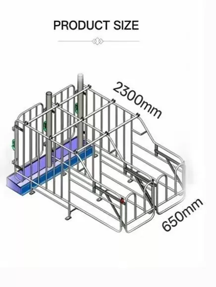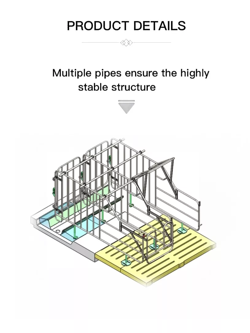 1.La porta con chiusura anteriore sicura con chiusura affidabile impedisce la fuga delle scrofe, con bordi metallici arrotondati per evitare lesioni agli animali.
